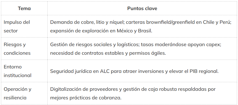 En 2026, la minería en LATAM acelera por demanda de cobre, litio y níquel, insumos críticos para la transición energética. Chile y Perú consolidan carteras brownfield y greenfield, mientras México y Brasil amplían exploración con mayor disciplina ambiental. El reto es acotar riesgos sociales y logísticos para evitar retrasos que erosionen rentabilidad. Tasas de interés moderándose desde 2024-2025 favorecen financiamiento de capex, pero el inversionista exigirá contratos estables y permisos ágiles. Países de ALC que ofrezcan seguridad jurídica atraerán inversiones y elevarán el PIB regional. La digitalización de proveedores y una gestión de caja robusta, apalancadas por mejores prácticas de cobranza, sostienen resiliencia sectorial y expanden la participación de América Latina en el mercado internacional de metales, fortaleciendo el crecimiento del negocio.