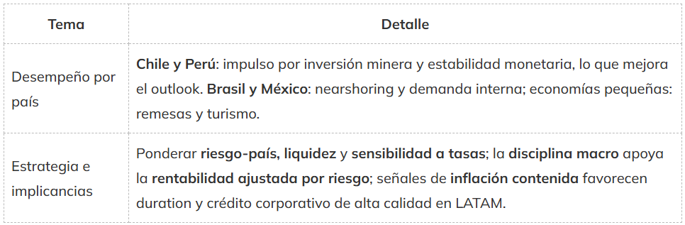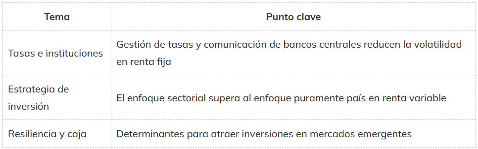 El periodo 2024-2025 dejó tres lecciones para América Latina y el Caribe: primero, que la gestión de tasas de interés y la comunicación de bancos centrales anclan expectativas y reducen volatilidad en renta fija; segundo, que el enfoque sectorial supera al enfoque puramente país en renta variable; tercero, que la resiliencia operativa y la caja son determinantes para atraer inversiones en mercados emergentes.