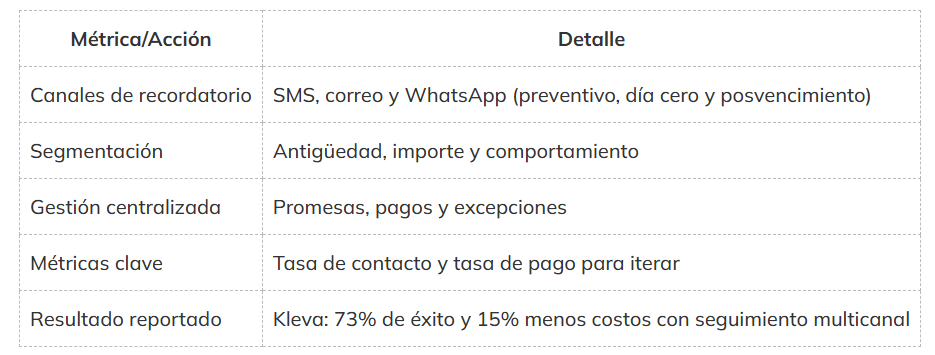 |La cobranza es el pulso financiero de cualquier negocio. Automatizar el proceso de cobranza acelera el cobro, reduce retrasos y mejora la relación con el cliente. En este artículo abordamos cómo cobrar con mensajes de cobro eficaces, el uso de mensajes de texto, correos electrónicos y a través de WhatsApp, y cómo la segmentación y la personalización elevan el resultado. Kleva orquesta recordatorios multicanal con IA, logrando 73% de promesas de pago y 15% de reducción de costos en LATAM.