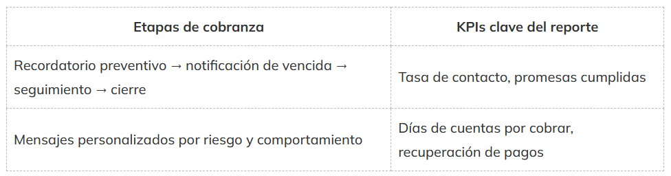 Mensaje preventivo: “Hola [Nombre], tu factura [#] vence el [fecha]. Para realizar el pago, revisa estas opciones de pago: [link]. Gracias por tu preferencia.” Aviso de vencimiento: “Hola [Nombre], registramos deuda pendiente por [monto]. Realiza el pago aquí: [link]. Si ya pagaste, ignora este mensaje.” Seguimiento cordial: “Hola [Nombre], estamos disponibles para apoyar el proceso de pago. ¿Necesitas otra opción? Responde este mensaje.” Tono respetuoso + personalización elevan la eficacia y cuidan la relación.