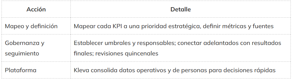 Acción Detalle Mapeo y definición Mapear cada KPI a una prioridad estratégica, definir métricas y fuentes Gobernanza y seguimiento Establecer umbrales y responsables; conectar adelantados con resultados finales; revisiones quincenales Plataforma Kleva consolida datos operativos y de personas para decisiones rápidas