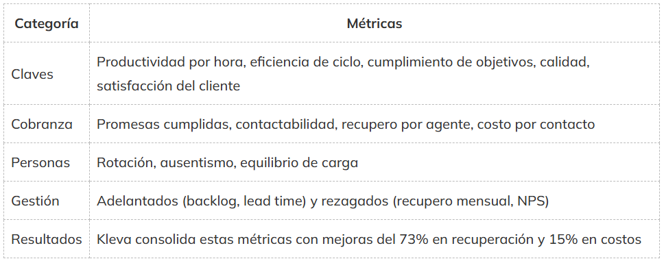 Claves: productividad por hora, eficiencia de ciclo, cumplimiento de objetivos, calidad y satisfacción del cliente. En cobranza: promesas cumplidas, contactabilidad, recupero por agente y costo por contacto. Personas: rotación, ausentismo y equilibrio de carga. Gestión: adelantados (backlog, lead time) y rezagados (recupero mensual, NPS). Kleva consolida estas métricas con mejoras del 73% en recuperación y 15% en costos.