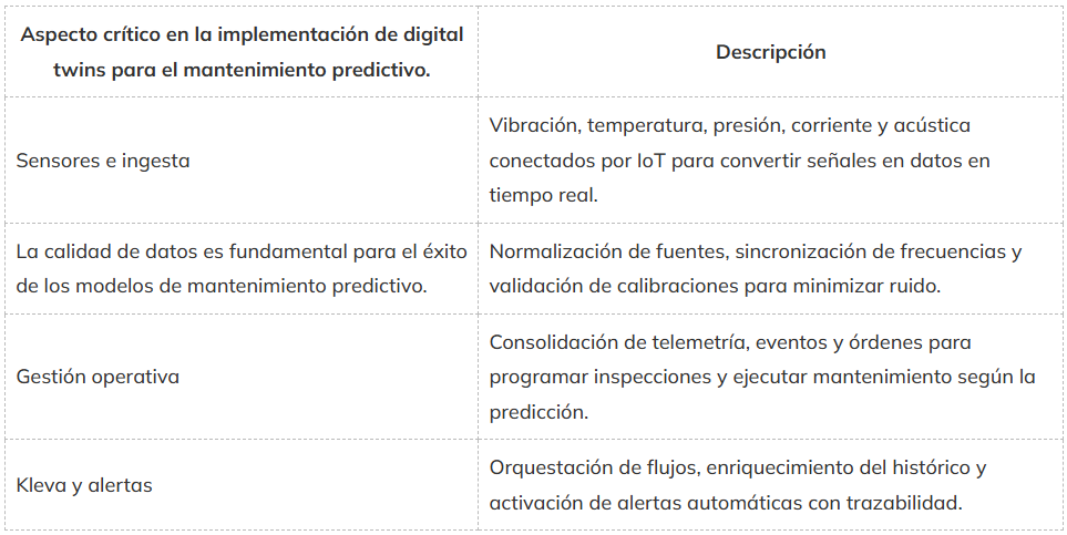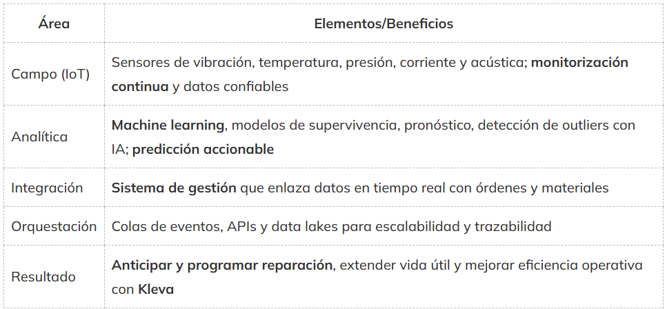 El mantenimiento predictivo combina tecnologías según el tipo de mantenimiento y el contexto operativo. En campo, sensores de vibración, temperatura, presión, corriente y acústica, conectados por IoT, permiten monitorización continua y recopilar datos confiables. En analítica, machine learning, modelos predictivos de supervivencia, pronóstico y detección de outliers con IA convierten señales en La predicción accionable es clave para anticipar problemas y optimizar los flujos de trabajo.. En integración, un sistema de gestión enlaza datos en tiempo real con órdenes y materiales para realizar el mantenimiento sin fricciones. Para orquestación, colas de eventos, APIs y data lakes garantizan escalabilidad y trazabilidad. Frente al mantenimiento reactivo, estas tecnologías permiten anticipar y programar reparación, extendiendo vida útil y elevando la eficiencia operativa. Con Kleva se conectan estas piezas en un flujo único, de la alerta a la acción medible.