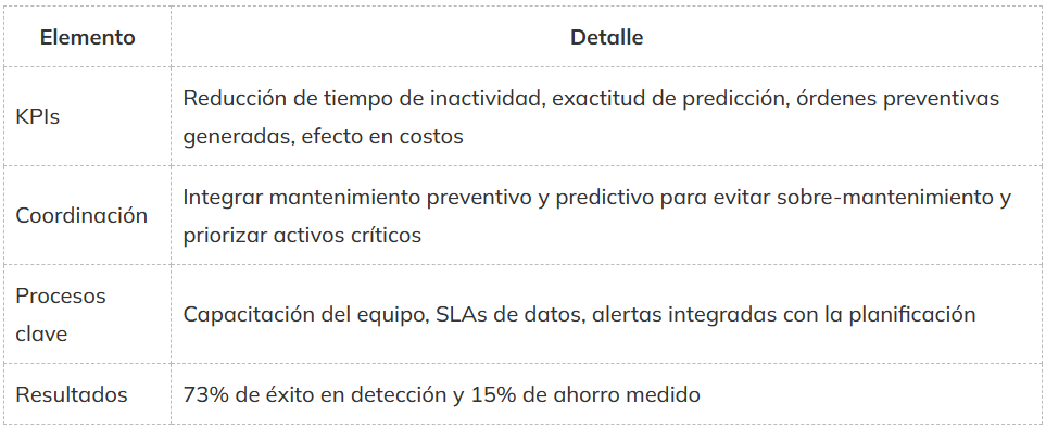Una implementación de mantenimiento predictivo efectiva se apoya en estrategias por etapas que incluyen seleccionar casos de uso de alto impacto, estandarizar taxonomías de mantenimiento y mapear flujos en el sistema de gestión. Se definen KPIs claros y se coordina mantenimiento preventivo y predictivo para evitar sobre-mantenimiento y priorizar activos críticos. Es vital capacitar al equipo, establecer SLAs de datos e integrar alertas con la planificación para programar ventanas de reparación. La gobernanza de modelos y datos garantiza continuidad frente a cambios operativos. Kleva permite orquestar estas etapas y demostrar resultados repetibles.